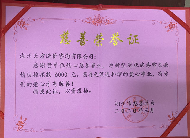 湖州天方造价咨询有限公司也为支援武汉献出自己的一份力量,我司号召全体员工为抗击新型冠状病毒进行爱心捐款。截止2020年1月31日,湖州天方造价咨询有限公司共筹得爱心捐款23000元整,我们将通过湖州市慈善总会为武汉送去温暖。
