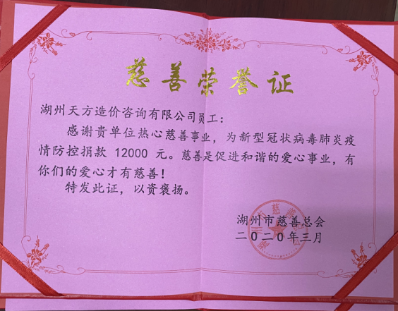 湖州天方造价咨询有限公司也为支援武汉献出自己的一份力量,我司号召全体员工为抗击新型冠状病毒进行爱心捐款。截止2020年1月31日,湖州天方造价咨询有限公司共筹得爱心捐款23000元整,我们将通过湖州市慈善总会为武汉送去温暖。